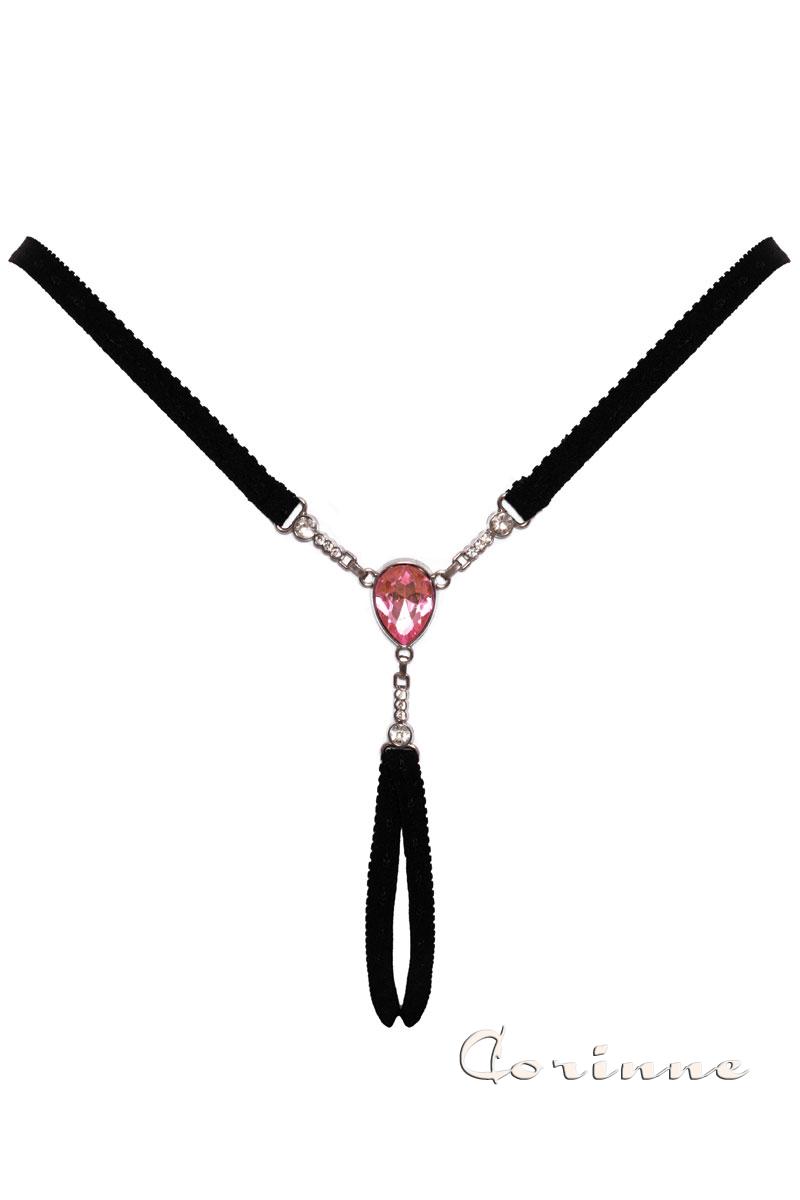 Più un gioiello che un perizoma! Perizoma nero aperto al cavallo, realizzato con cinghie morbide e molto elastiche, con un triangolo aperto sul retro. Davanti è caratterizzato da una grande gemma rosa e una catena argentata con strass incastonati. Fianchetti regolabili per il massimo confort.