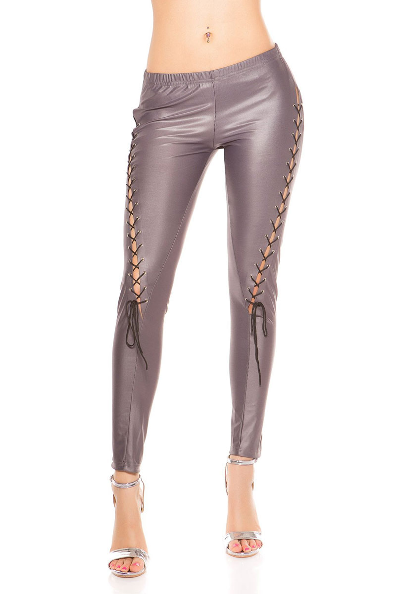 Leggings sensuali in tessuto grigio elasticizzato, effetto bagnato con allacciature frontali.
