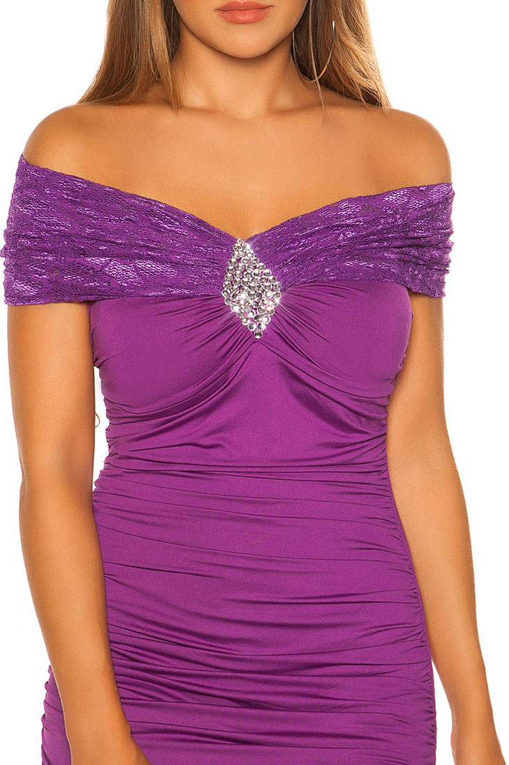 Miniabito viola con sensuale scollo alla carmen, ampio bordo in pizzo nella parte superiore e scintillanti strass sul décolleté! L'abito è sapientemente arricciato e sottolinea con eleganza le tue curve femminili. Lo scollo mostra delicatamente le spalle e conferisce al vestito un tocco romantico. L'ampio bordo in pizzo aggiunge un tocco di raffinatezza mentre la spilla scintillante sul décolleté crea un effetto glamour. Il miniabito è realizzato con materiali di alta qualità e garantisce una vestibilità confortevole. Che sia per occasioni speciali o serate emozionanti, questo miniabito è il compagno perfetto per un look indimenticabile.
