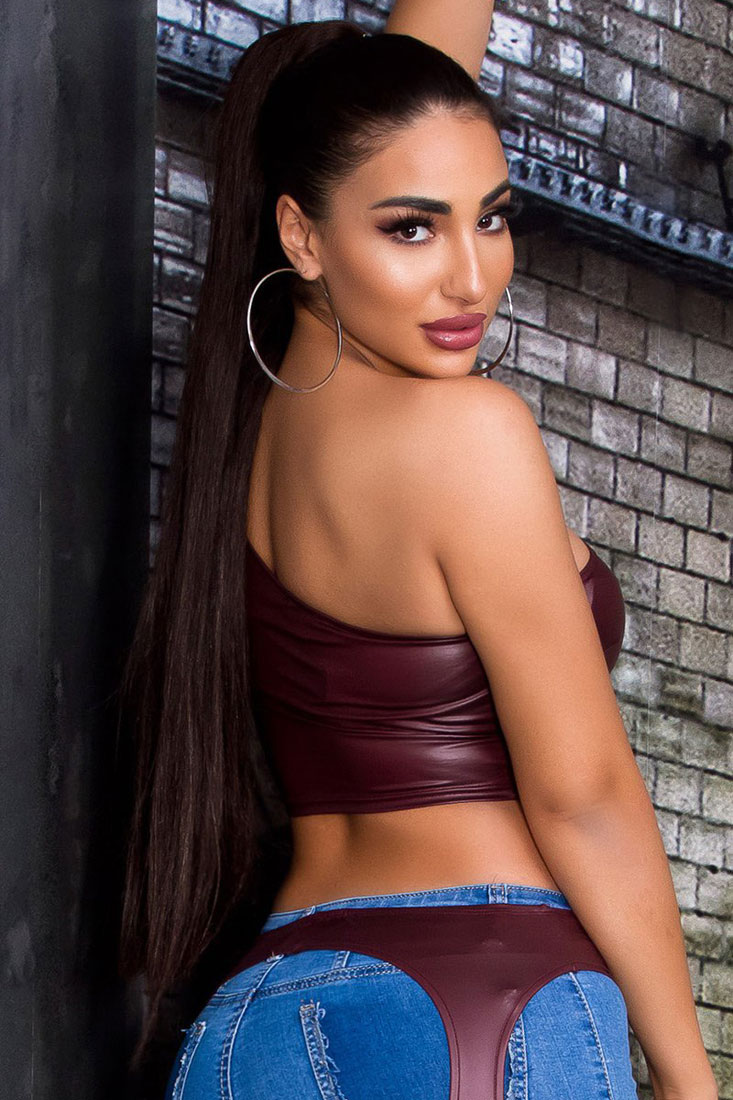 Top corto monospalla effetto bagnato. Bordeaux